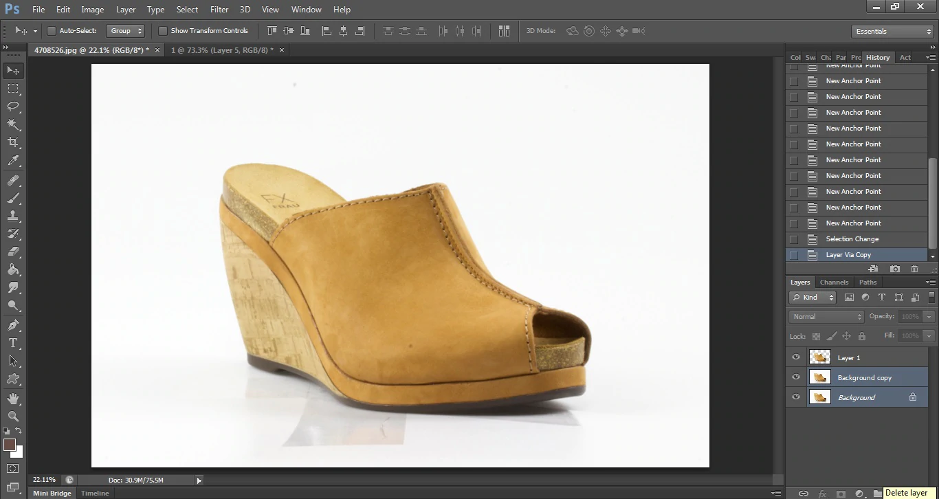 選択が完了したら、画像の背景(背景をクリックして[削除]を押すだけ)と背景レイヤーの両方を削除します。 背景レイヤーを削除すると、背景が透明な完璧な商品画像が残ります。