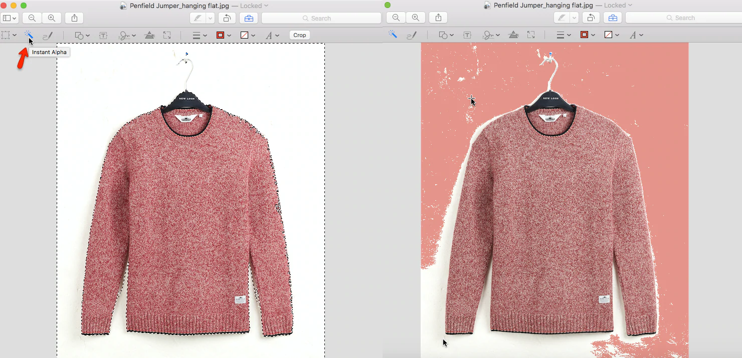 Previewは、「InstantAlpha」ツールも提供します。 マークアップツールバー(魔法の杖のようなアイコン)から「インスタントアルファ」を選択したら、画像の背景をクリックしてドラッグします。 選択内容を示すために、画像の領域の色が変わります。 目的の領域を選択したら、削除キーを使用してその領域を削除します。