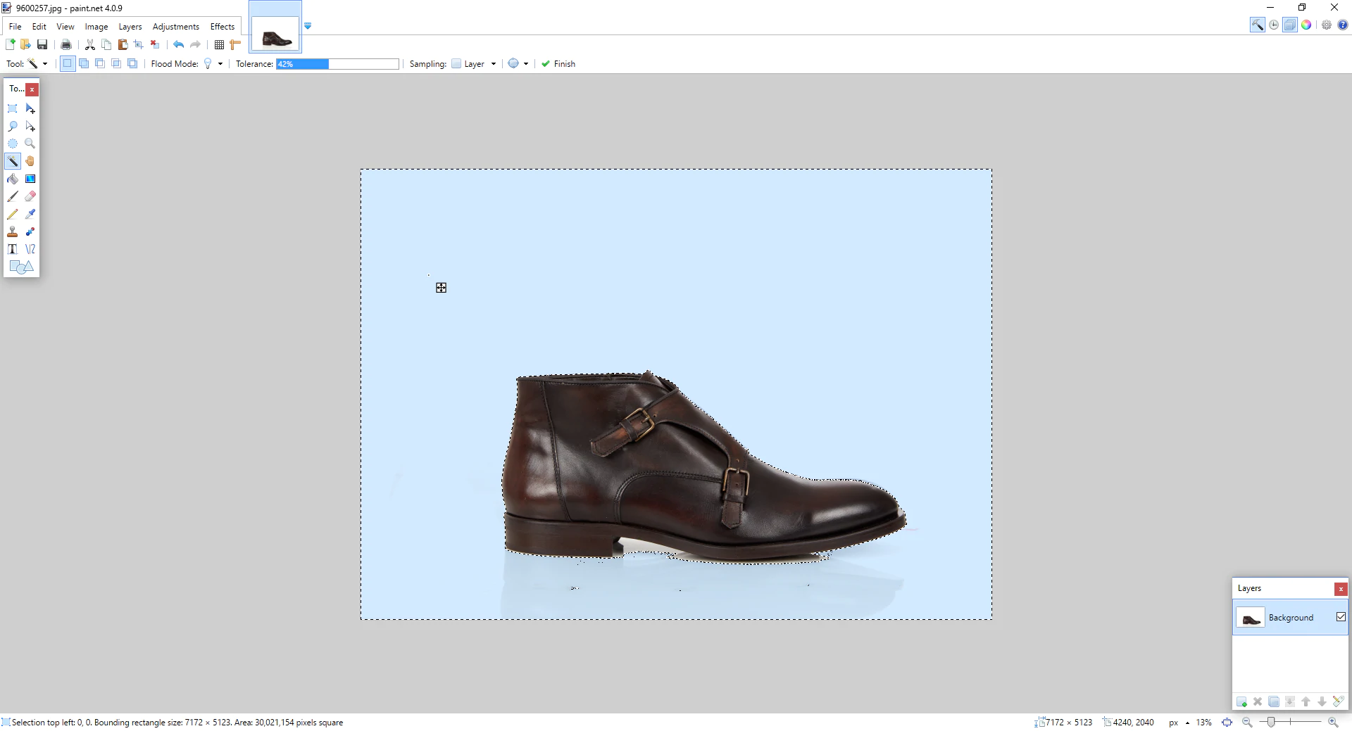 製品を選択して背景から分離するには、まずマジックワンドツールを使用して靴の一般的な形状を選択します。