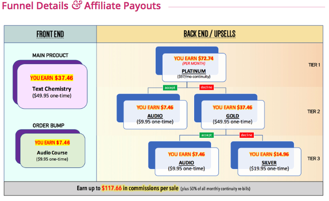 この最後の目標到達プロセスのマップは、ClickBankで複数のデートと人間関係のオファーがあるLoveLearningsからのものです。 このマップを使用すると、各製品の請求頻度を簡単に理解できるため、アフィリエイトは定期的なコミッションを行うことがわかります。