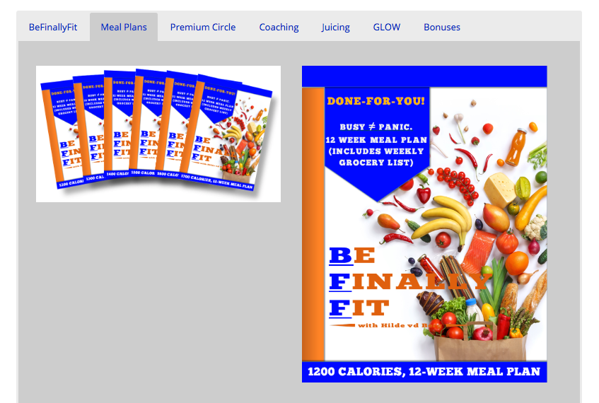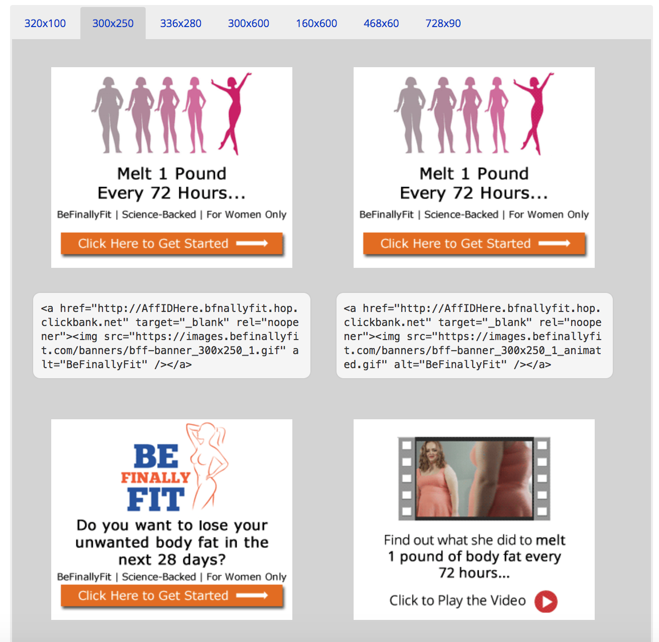 ClickBankの減量オファーであるBeFinallyFitには、アフィリエイトがオファーをうまく宣伝するために必要なほぼすべてのものを備えた素晴らしいアフィリエイトツールページがあります。 彼らが提供するさまざまな製品画像を見てください。