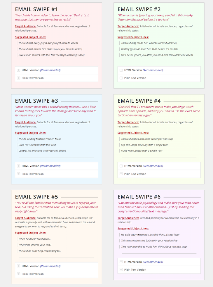 シークレットアフィリエイトは、アフィリエイトが必要に応じて使用および編集できるように、多くの電子メールスワイプを提供します。