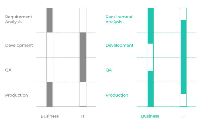 世界中のIT専門家は、時間の半分をやり直しに費やしていることを認めています。 リワークの発生は、ITチームとビジネスチームの間の見解の変化が原因で発生しました。 Rapid Mobile Application Developmentは、要件分析、開発、QA、および本番のすべてのプロセス(上の画像の右側に示されている)で、ITとビジネスの両方を統合することによってプロセスを容易にします。 この方法は、開発と検証を並行して実行するために機能するため、やり直しが大幅に削減され、コスト超過が保護されます。
