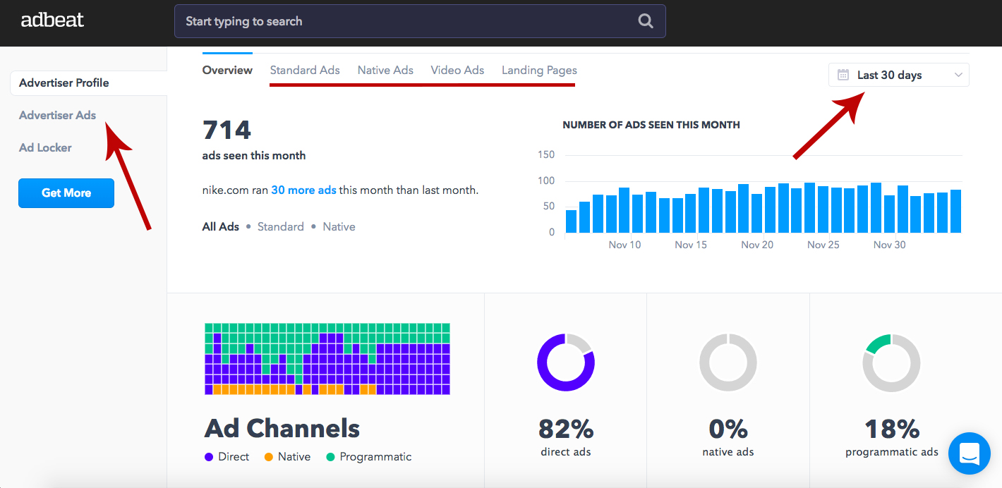 •Adbeat—監視する特定のブランドがわかっている場合の優れたツール。 Adbeatを使用すると、すべての広告主の広告、そのパフォーマンスデータ、広告チャネルなどにアクセスできます。