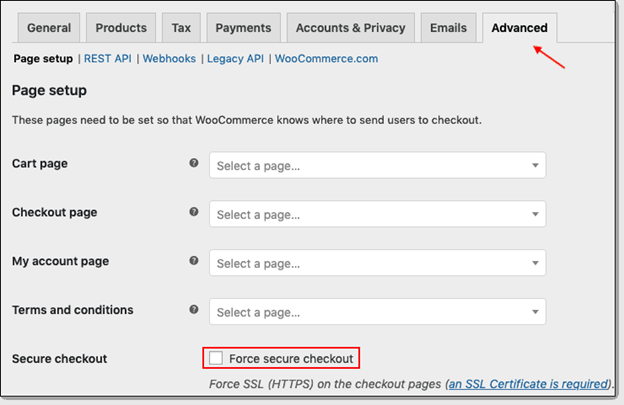 設定オプションで[詳細設定]を見つけて、[安全なチェックアウトを強制する]を有効にします。 Googleのような人気のある検索エンジンがHTTPSWebサイトをプッシュするにつれて、SSLが必要になります。 これにより、URLアドレスバーの南京錠で示されるWebサイトでHTTPSが有効になります。