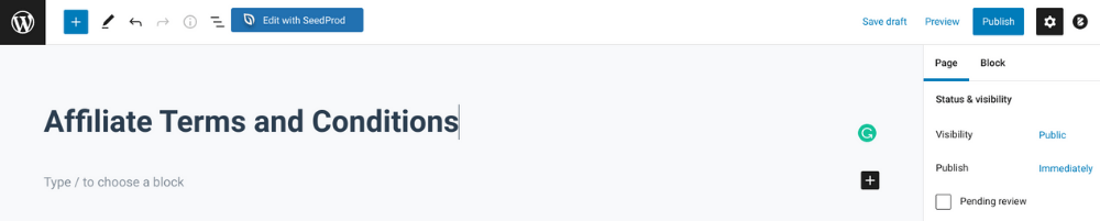 WordPressでアフィリエイト利用規約ページを作成します。 シンプルに保ちたいので、見栄えを良くする必要はありません。基本的なレイアウトを使用してください。