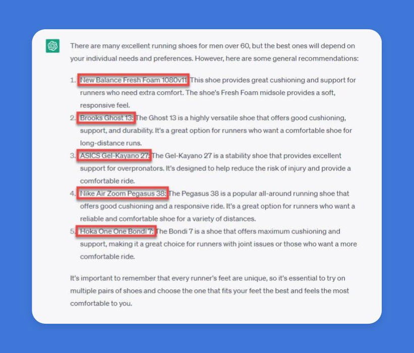 60 歳以上の男性向けのランニング シューズのリストをチャットボットにクエリすると、ブランド名のリストが表示されます。