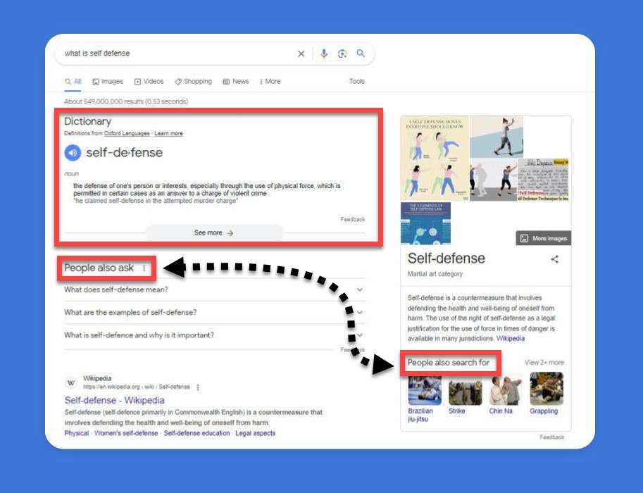したがって、「自衛とは何ですか?」というクエリを Google で検索すると、辞書の定義を探すことになるかもしれません。