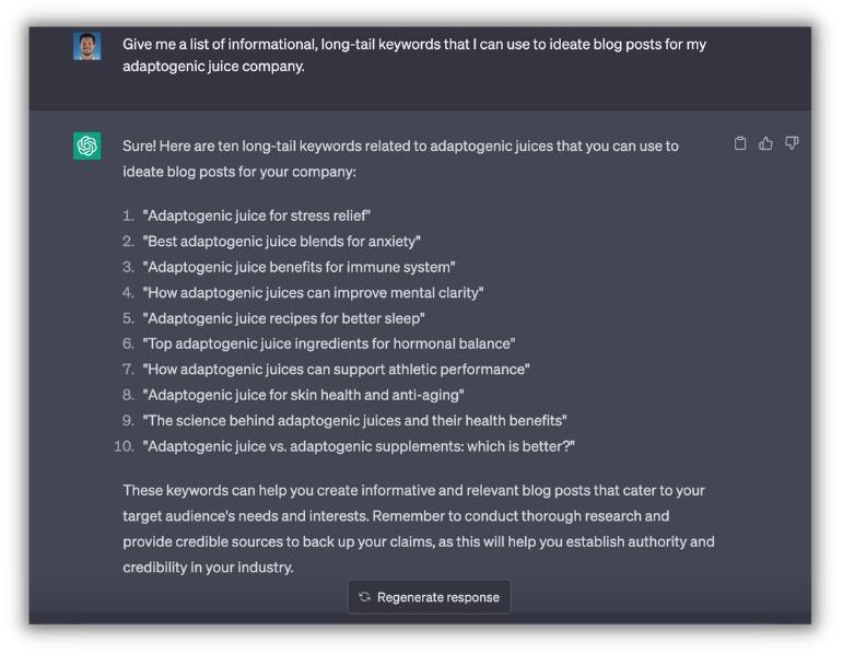 ChatGPT は、キーワード調査、つまりターゲティングする広告グループのリストと構造のキュレーションにも役立つツールです。 (ただし、これを主要なキーワード調査ツールとして使用することはお勧めしません。)