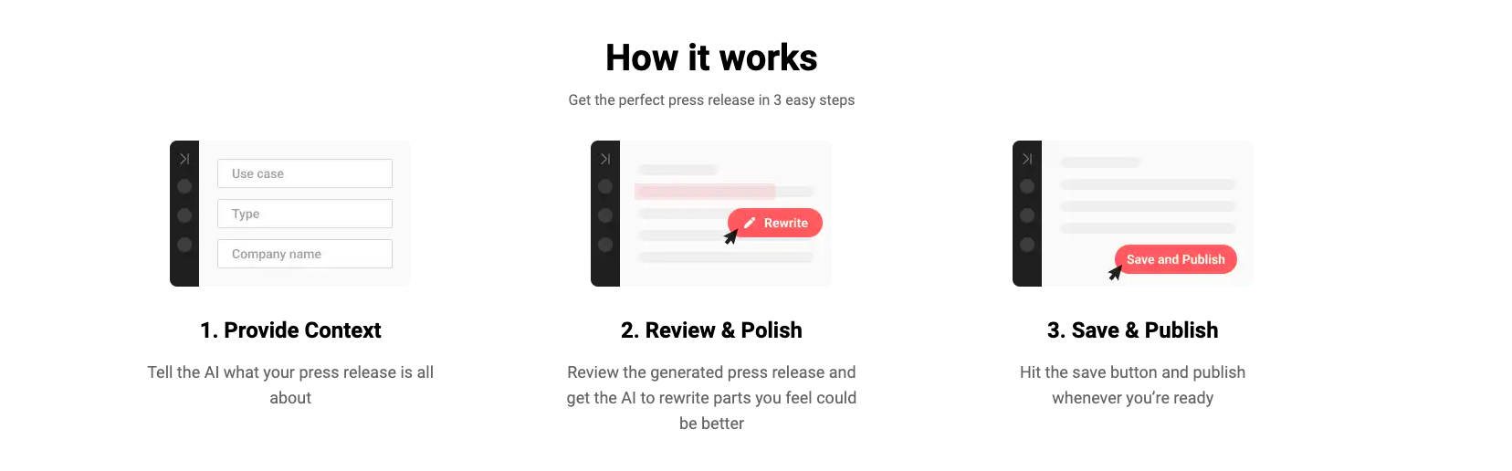 1. プレスリリースの作成を簡素化: 企業のプレスリリース作成プロセスを簡素化します。
