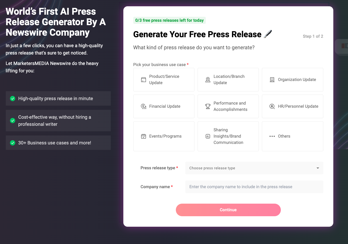 一言で言えば、MarketersMEDIA AI プレス リリース ジェネレーターは、広報とマーケティングの分野における卓越性の輝かしい例として挙げられます。 この画期的なツールは、イノベーション、手頃な価格、多用途性、専門知識、使いやすさをシームレスに融合させて、真に独自のプレスリリースを作成します。