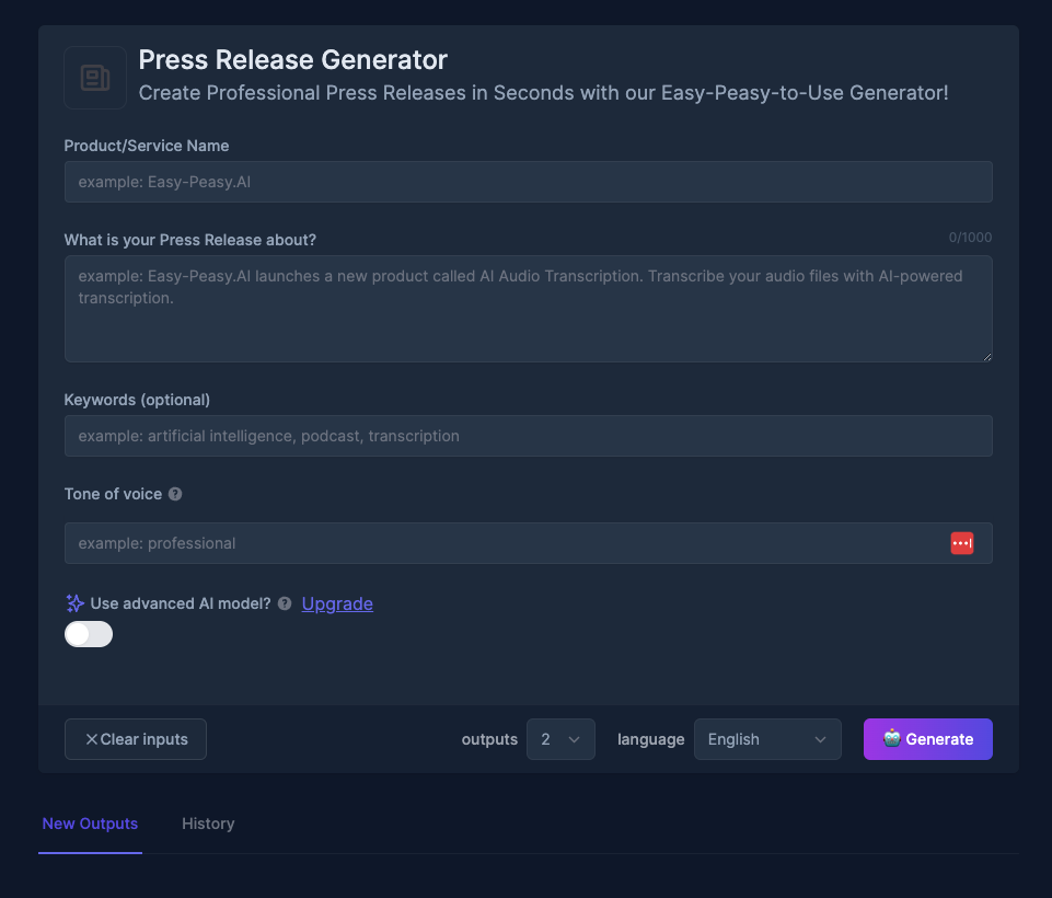 Easy-Peasy AI プレス リリース ジェネレーター