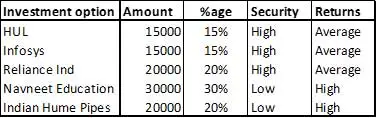 投資家は最初にRs1,00,000を持っており、マネージャーはこれをさまざまな投資オプションに分配する必要があるとします。 したがって、リスクテイク能力と計算されたリターンの種類に応じたポートフォリオマネージャーは、それと連携して構造化されたポートフォリオを提供します。