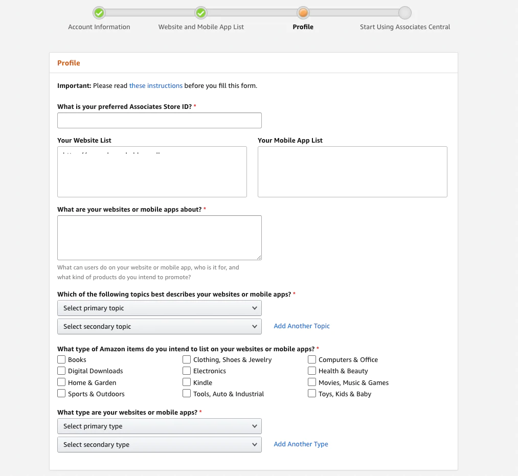 このセクションでは、Webサイトに関する情報(および、通常は会社名となる優先ストアID)を入力するように求められます。 Amazonは、あなたのWebサイトが何であるか、そしてあなたがリンクを構築する製品の種類を知りたがっています。