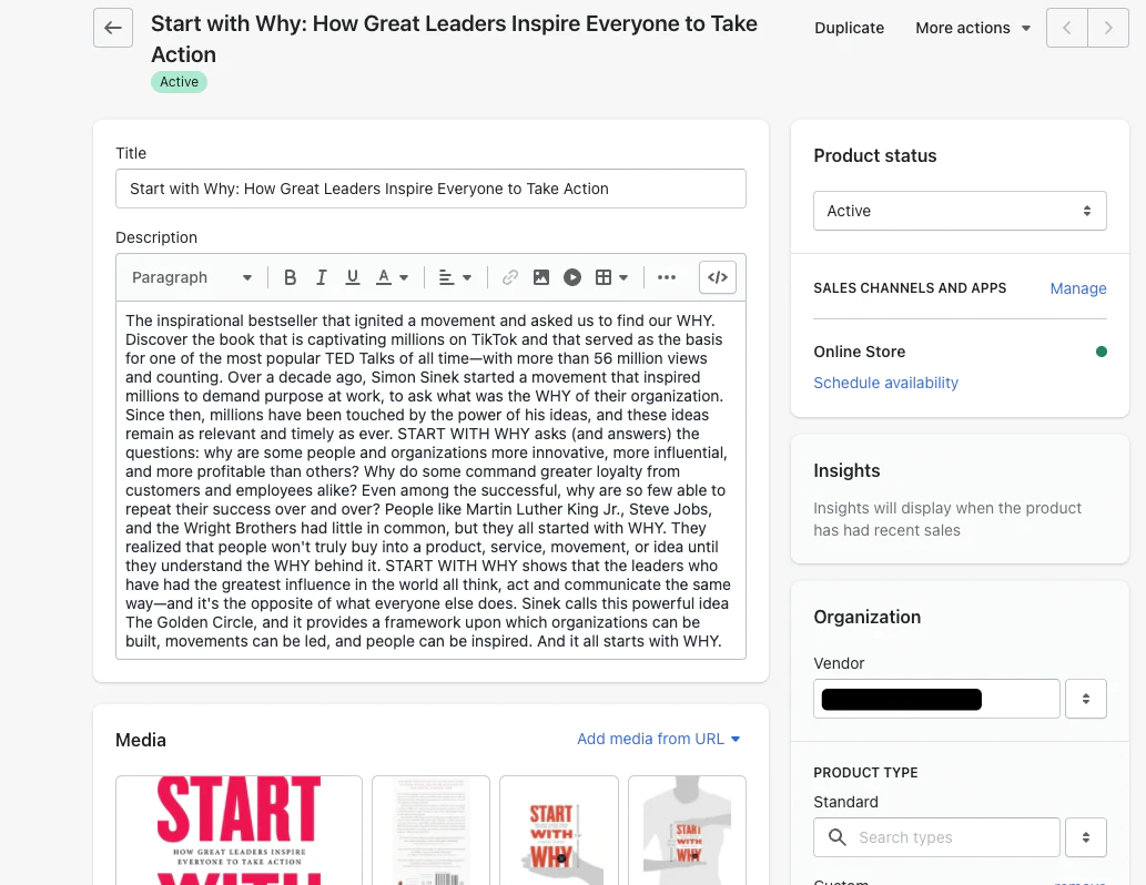 クリックすると Shopifyで表示 リンクをクリックすると、Shopifyの製品ページエディターに移動します。ここで、次のように詳細をカスタマイズできます。