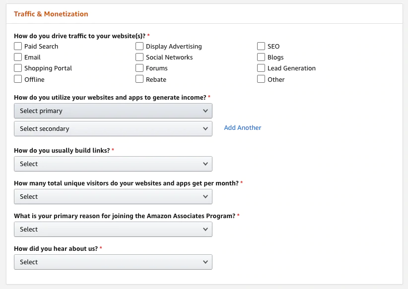 次のセクションでは、サイトへのトラフィックを増やす方法を説明するように求められます(複数のオプションを選択できます)。 また、ウェブサイトやアプリが現在どのように収入を生み出しているか、リンクを構築する方法、ユニークな訪問者の総数、プログラムに参加したい理由を共有する必要があります。