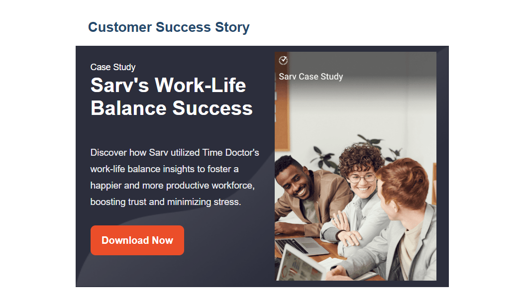 上の画像は、Time Doctor による成功事例またはケーススタディを示しています。 「今すぐダウンロード」ボタンを追加してランディング ページにリンクすることで、ブランドはエンゲージメントを生み出し、この電子メール キャンペーンがいかに効果的であるかを示すデータの収集を可能にします。
