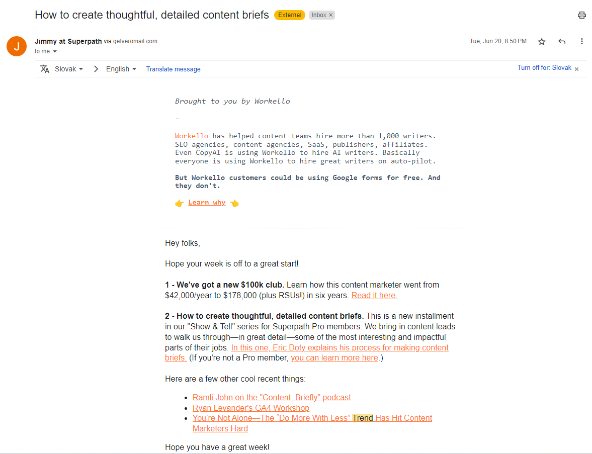Superpath の Jimmy Daly は、有用なブログ コンテンツのまとめをコンテンツ マーケティングの視聴者に毎週送信します。