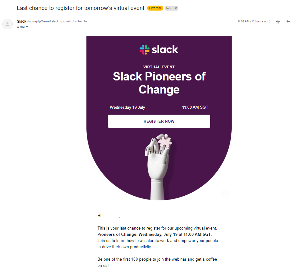 この例では、Slack は企業に対し、従業員の生産性を向上させる方法を学ぶことを約束しています。 それだけでなく、最初の 100 人の参加者に無料のコーヒーを提供することで、契約をさらに有利にしています。