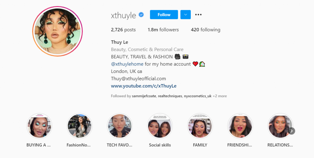Thuy Leは、ロンドンを拠点とするメイクアップアーティスト、美容インフルエンサー、 YouTubeの有名人であり、メイクアップチュートリアルは美しくて面白いものです。 彼女のYouTubeチャンネルで、Thuyはvlogを介して彼女の人生について共有しています。タブーはありません。彼女は、ブラジルのお尻のリフト、整形手術の経験などについて共有しています。 人生の最新情報に加えて、いくつかの有名ブランドの製品レビューを見つけることができます。 過去には、Urban Decay、Fenty Beauty、TooFacedなどのブランドと提携しています。