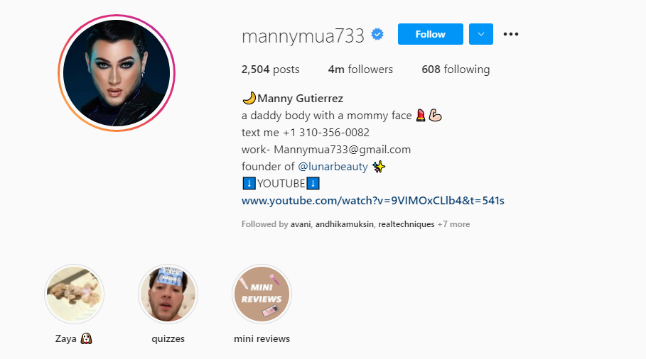 マニー・グティエレスは、Instagramで400万人以上のフォロワーを持つ独学の美容インフルエンサーです。 彼のフィードでは、製品レビュー、メイクアップチュートリアル、ライフスタイルの投稿を共有し、フォロワーに低品質のメイクアップを機能させるためのヒントを提供しています。 彼はサブスクリプションベースのビジネスBoxyCharmと提携し、 LunarBeautyなどのブランドを代表しています。 さらに、彼はライザ・コシのような他のインフルエンサーと協力しています。 男性を識別し、ボディポジティブな美容インフルエンサーを探しているなら、今すぐマニーグティエレスに従ってください。