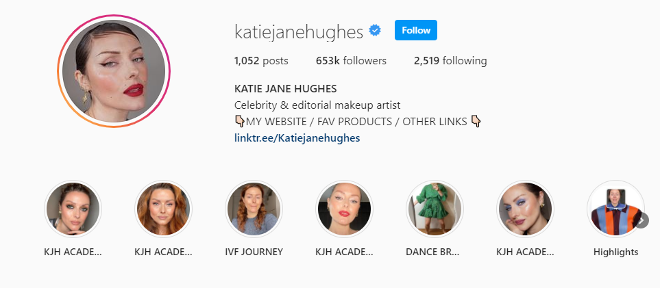 Katie Jane Hughesは、有名人で編集者のメイクアップアーティストであり、彼女のプラットフォームを使用して、涙にぬれた新生児の輝きを得る方法から、すぐに使えるメイクアップルックのヒントまで、フォロワーにすべてを教えています。 彼女はNet-a-Porter、Weleda、Glossierなどのブランドと提携しており、大胆で活気のあるメイクアップのルックスで知られています。 彼女のInstagramアカウントには、スキンケアのアドバイスと美容のヒントがあります。