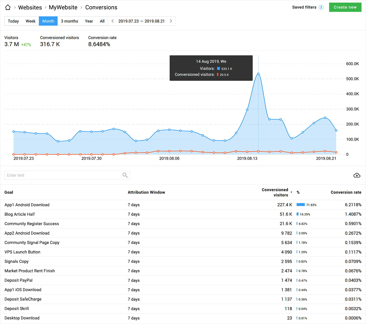 Fintezaによる詳細コンバージョンレポートにコンバージョン率と一緒に、所望の活性を完了者への洞察を与えることができます。