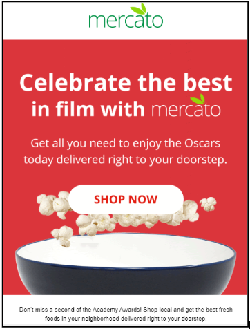 3 –率直に。 大声で言ってごらん。 オンデマンドの食料品サービスMercatoがこの戦術をどのように使用しているかを次に示します。 この電子メールは、ユーザーが自宅の便利さから注文し、待望のエンターテインメントを見逃さないように動機付けます。