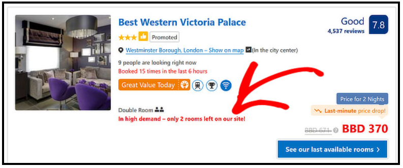 1 –「ほとんどの人がすでに行動した」および「見逃す可能性がある」ことを証明する統計を表示します。 Bookings.comはそれを完璧に行います。