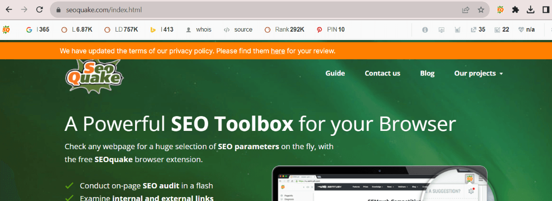 SEOQuake は、ブラウザに SEO ツールバーを追加する無料の Chrome 拡張機能です。 単独で使用してもある程度のデータは取得できますが、無料の Semrush アカウントに接続すると、より多くのメトリクスを取得できます。