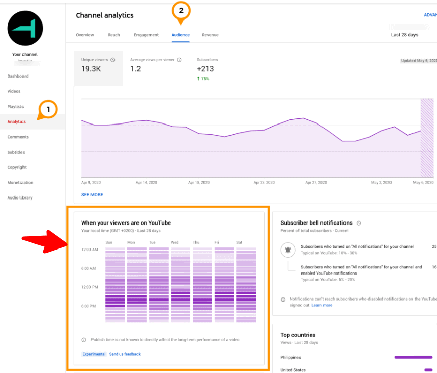 チャンネルが YouTube に投稿するのに最適な時間を見つける最良の方法の 1 つは、アナリティクスを使用することです。 アクセス方法は次のとおりです。