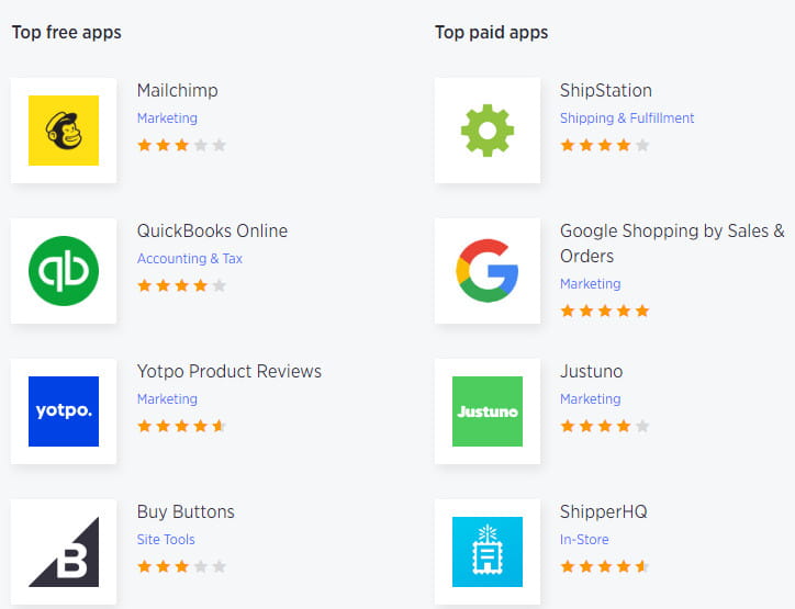 BigCommerceのアプリストアには、プランの機能が提供する以上のものを探している場合に購入できる追加のアプリがあります。 これらのアプリを使用すると、BigCommerceプランに機能を簡単に追加できます。 一部のカテゴリは、ビジネス管理の特定の側面を扱います。 経理、CRM、マーケティング、配送などのアプリがあります。