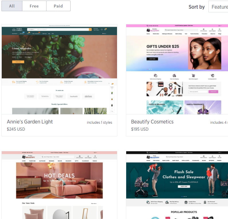 各テンプレートには、いくつかのバリエーションもあります。 いくつかの有料のBigCommerceテーマも利用できます。 価格は150ドルから300ドルの範囲です。