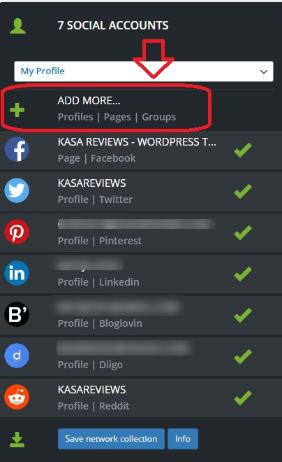 新しい投稿を自動公開する場合は、右側のネットワークパネルにあるドロップダウンメニューを使用して、事前定義されたネットワークセットを選択します。 目的のアカウント、ページ、グループ、またはプロファイルをクリックしてオン(緑色のチェックマークが表示されます)またはオフ(ネットワークがフェードとして表示されます)にすることで、このセットから特定のネットワークを追加または削除できます。