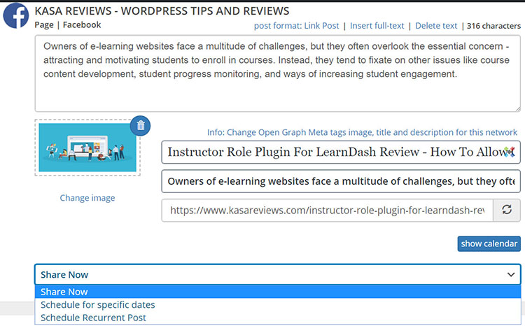 これらの投稿をすぐに共有することも、1回限りまたは定期的に投稿をスケジュールすることもできます。 複数の投稿を同時に準備することもできます。 これにより、WordPressコンテンツのプロモーションキャンペーンを事前に準備してスケジュールすることができます。