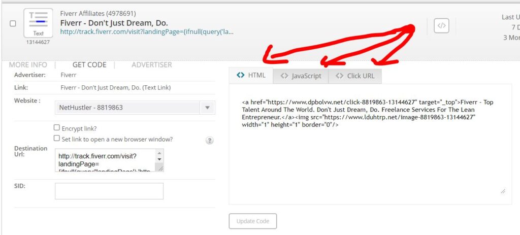 そのフィールドにたとえば FishArticle などを手動で追加し、[コードの更新] をクリックして、「FishArticle」SID を持つ新しいアフィリエイト リンクを取得するだけです。 次に、そのリンクを「魚の記事」で使用して、その製品を宣伝します。