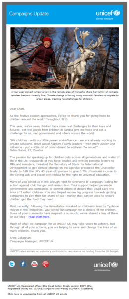 ユニセフのキャンペーン マネージャーからのこのメールは、パトロンが達成を支援している影響を思い出させてくれます。 パーソナライズされたオープナーと、組織が取ることができた行動に関する最新情報により、数字で! — 読者のサポートのおかげで、電子メールは、受信者を長期的にパトロンとして維持する可能性が高い接続を生成します.