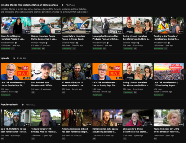 Invisible People は、ストーリーを共有し、一般の視聴者を教育することで、ホームレスに関する意識を高め、ポリシーを策定する非営利団体です。 その YouTube チャンネルには 100 万人近くの登録者がおり、Humans of New York と同様に、実際のホームレスの人々、彼らの苦労、笑顔のストーリーを共有しています。