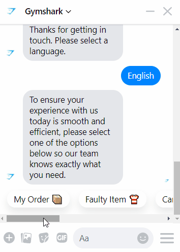 誰かが私たちにメッセージを送る準備をするとき、私たちのカスタマーケアボットは彼らを歓迎し、彼らがどのように支援できるかについていくつかのオプションを提供します。 私たちはルールを設定しているので、顧客はいつでも人間の援助を要求することができます。