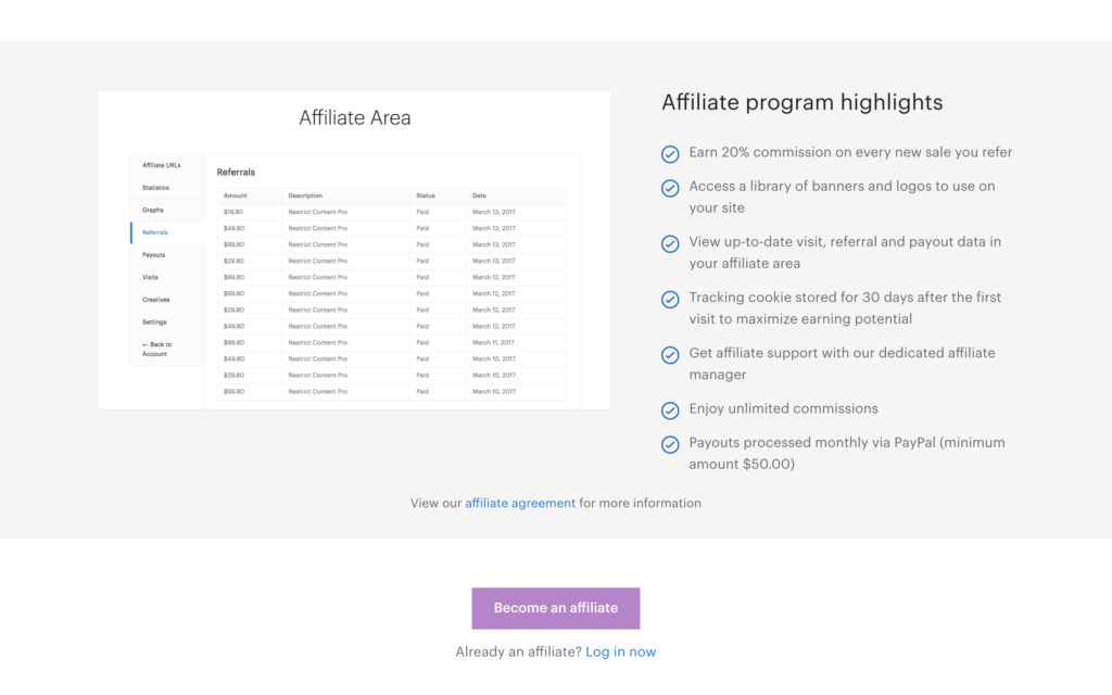 アフィリエイトになるために顧客に十分な自信を与えたい場合は、意思決定に必要な関連情報を顧客に提供することが重要なステップです。 専用のアフィリエイトページを用意することで、既存の顧客やその他のアフィリエイト候補者にとって、物事を前もって透明に保ち、理解しやすくなります。