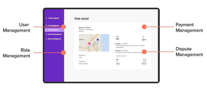 電動スクーターアプリのコスト見積もりに寄与する機能セットについて話すとき、私たちが考える2つのバージョンがあります:ユーザーと管理者。