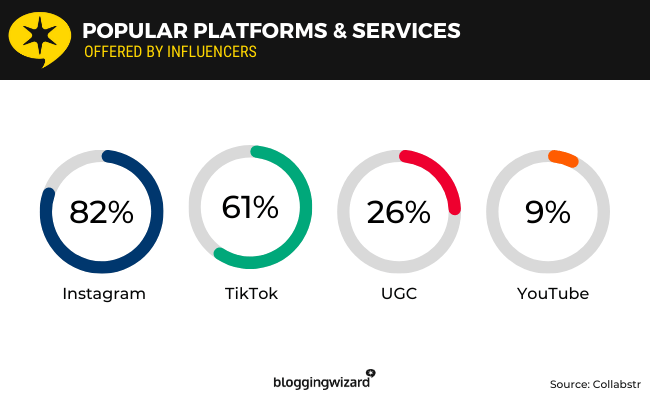 Collabstr が 50,000 人のインフルエンサーを調査したところ、82% がブランドに有料コラボレーションを提供するために Instagram を使用していると報告し、61% が TikTok を使用していることがわかりました。
