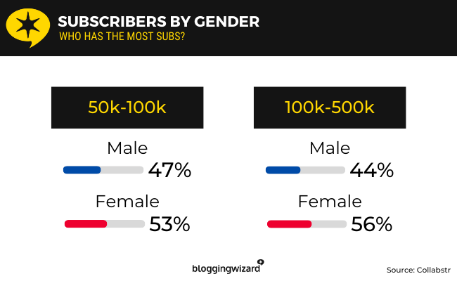 チャンネル登録者数5万~10万人のYouTuberの53%が女性で、47%が男性だ。