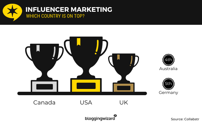 ブランドとインフルエンサー間の有料コラボレーションで最も人気のある国は米国で、カナダ、英国、オーストラリア、ドイツがそれに続いた。