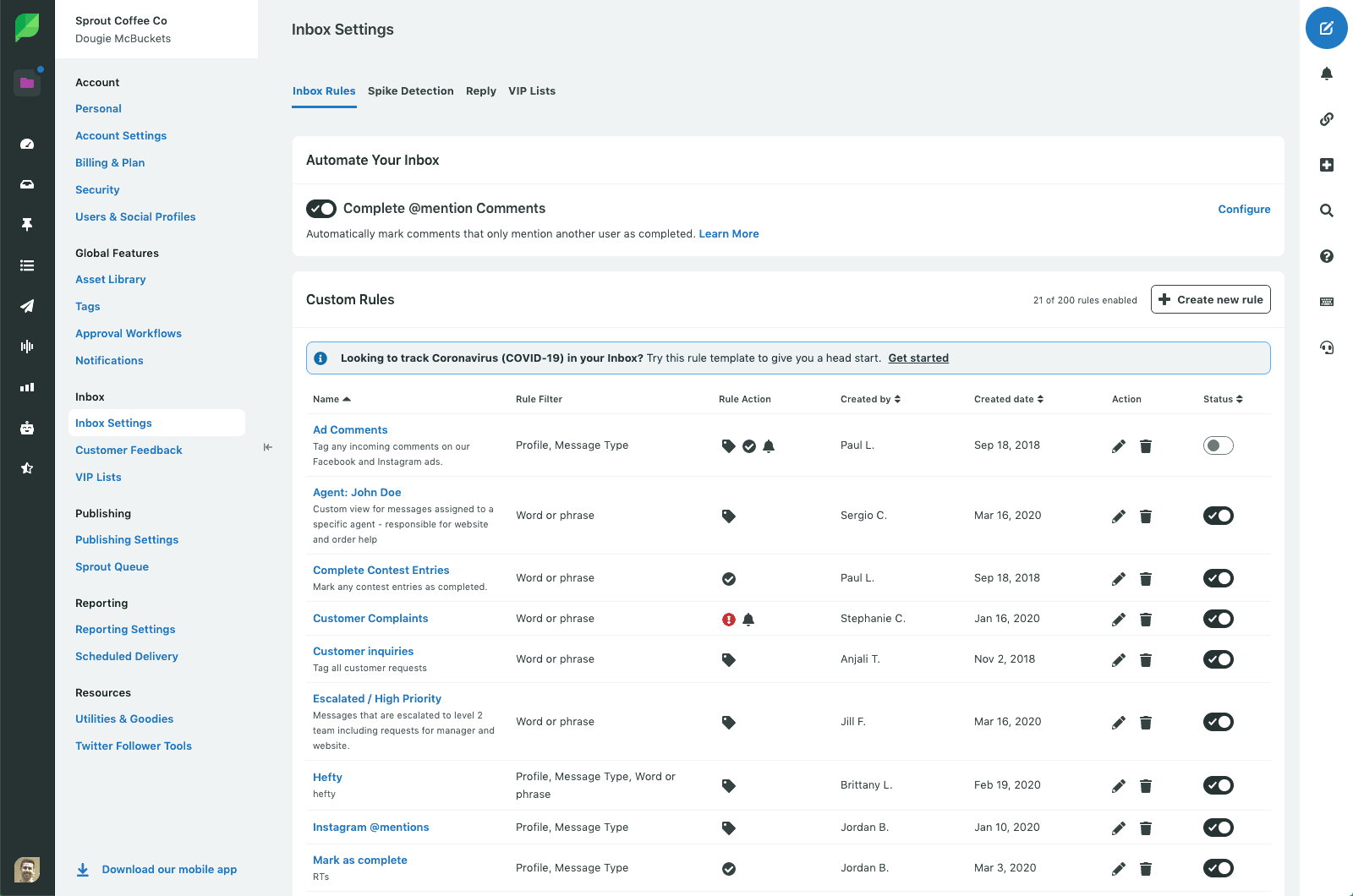 多くのお客様にとってCOVID-19の会話を見つけて追跡することの重要性を考慮して、COVID-19受信トレイルールテンプレートも作成しました。 このテンプレートを使用すると、受信トレイルールを簡単に設定して、これらのメッセージに対してアクション(タグ付け、完了、アラートの取得)を自動的に実行できます。 さらに、チームはタグベースのカスタム受信ボックスビューを作成して、これらすべての会話を1か所で管理できます。