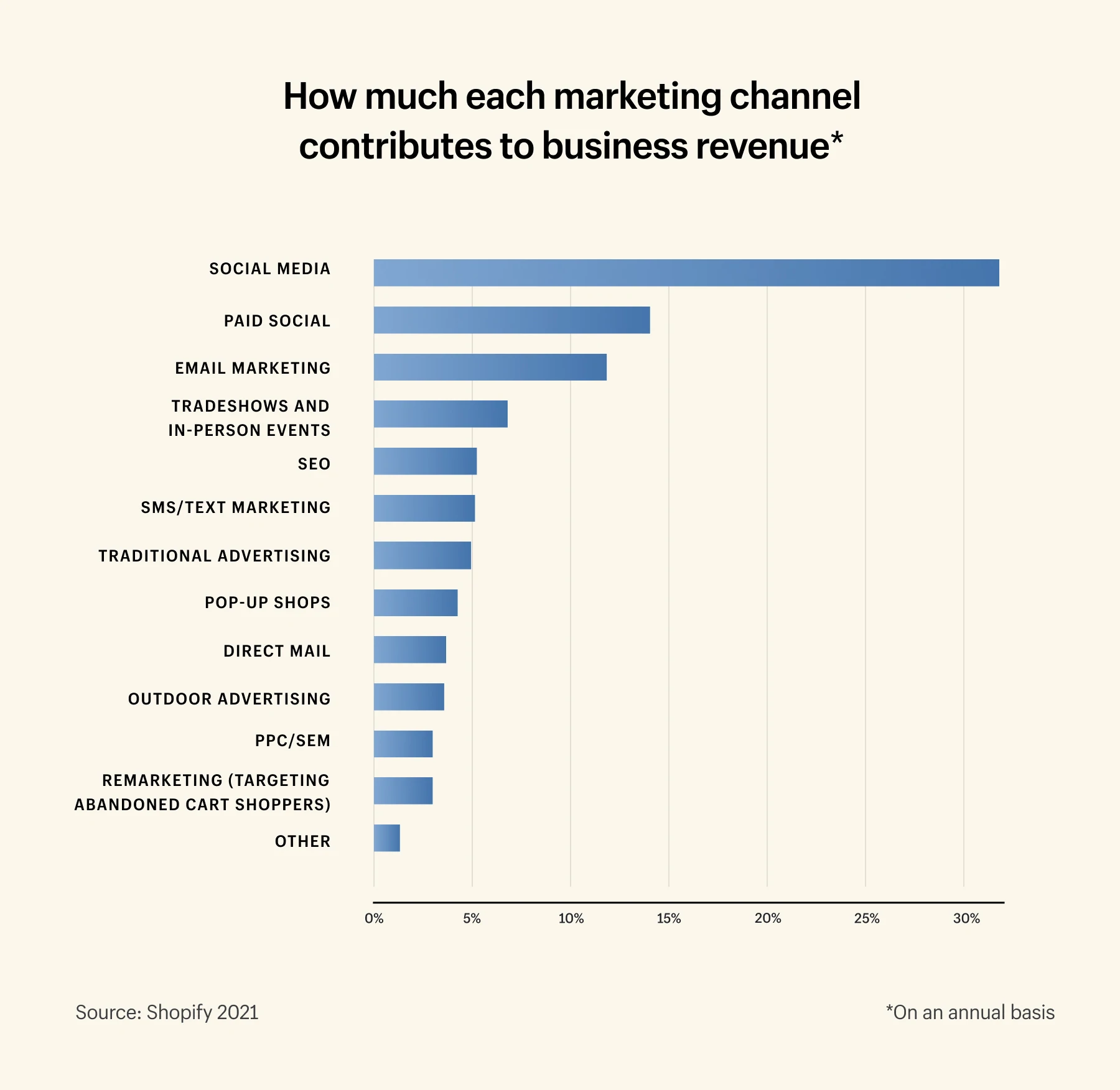 ビジネス収益(総売上高)への全体的な貢献に関して、私たちの調査では、すべてのeコマースブランドが最初から優先すべきチャネルがいくつかあることがわかりました。 業界に関係なく、データは、ソーシャルメディア、有料ソーシャル、および電子メールマーケティングが上位3つのコンバージョンマーケティングチャネルであることを示しています。