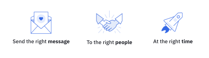 すべての顧客に、すべてのコミュニケーションが彼らのためだけに作成されたように感じさせる機能が可能です。 顧客のライフサイクル全体からのデータを使用して、送信するのに最適なコンテンツ、送信するタイミング、送信方法、さらには提供するものを選択できます。