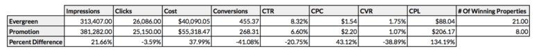 プロモーション広告を失敗と呼ぶ前に、データをブランド以外のキャンペーンに限定して、もう1つの側面を見てみましょう。 この種のプロモーションは、特定のアパートコミュニティを検索するのではなく、カスタマージャーニーの比較段階にある、より効果的なユーザーになると予想されるため、プロモーション広告が非常緑広告よりもパフォーマンスが優れている可能性があります。 -ブランド検索。 以下の表では、ブランド検索のデータが削除されています。