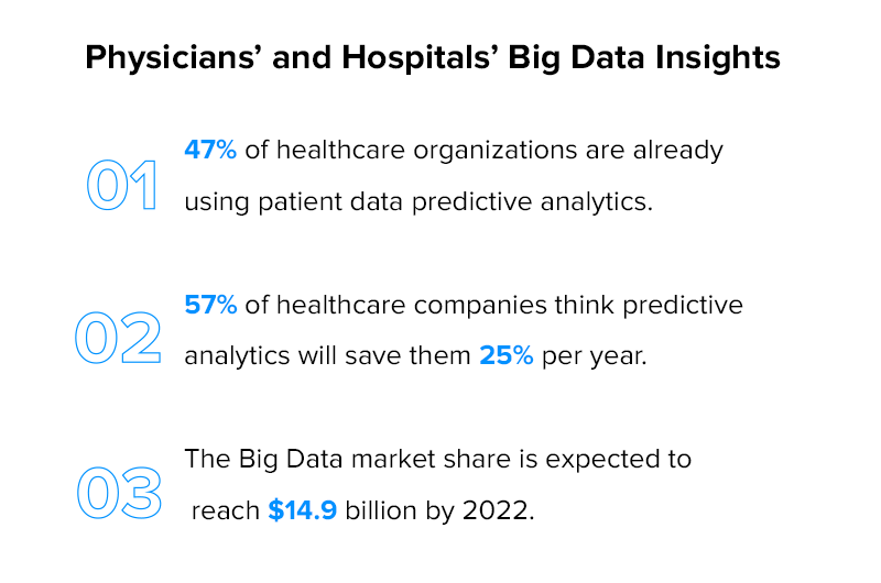 • 正確な人員配置–予測分析を通じて、ビッグデータは推定入院率に関する病院情報を取得できます。 これは、順番に、患者に対処するために必要なスタッフの割り当てで施設を助けることができます。