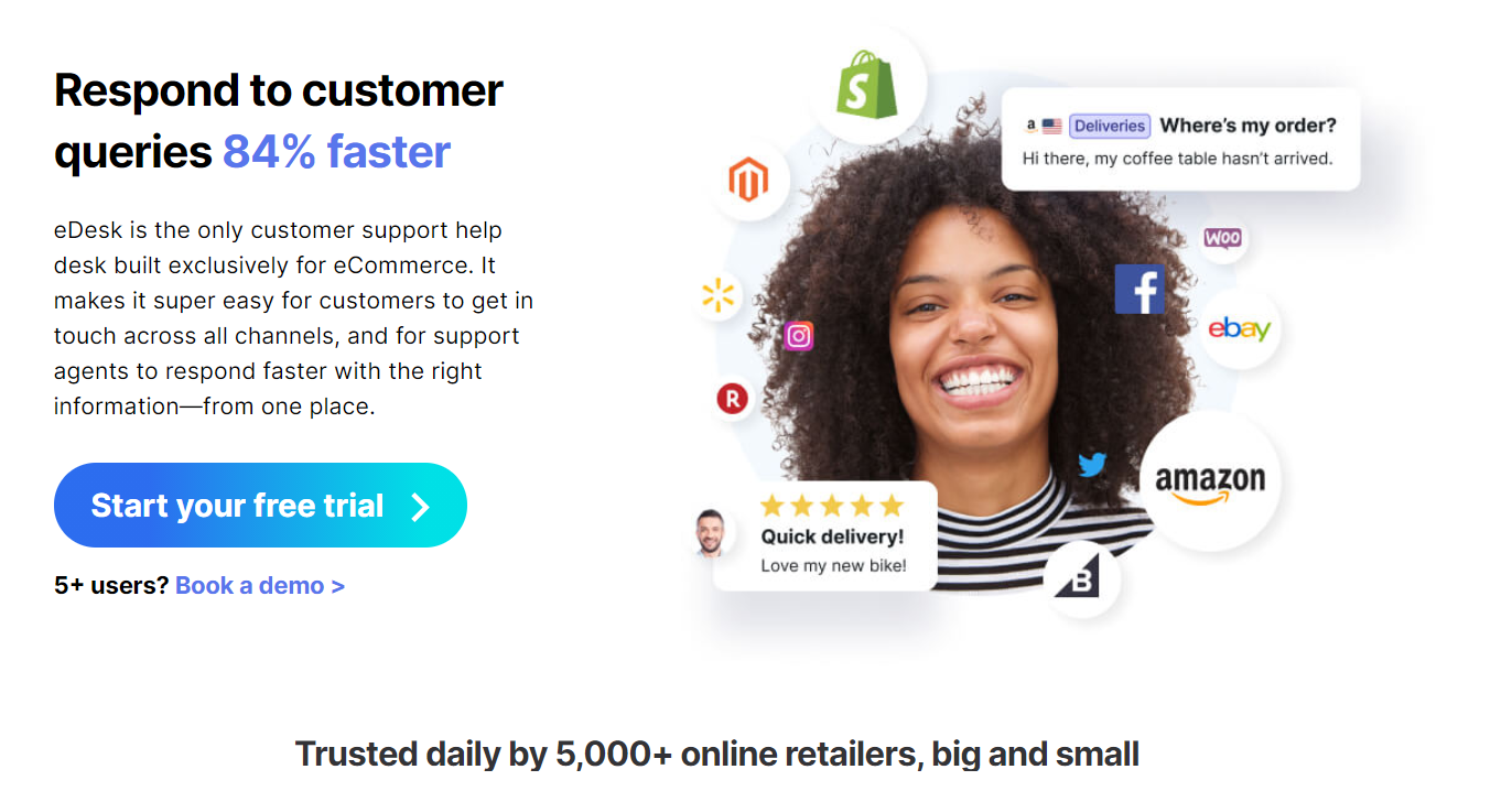 eDeskは、eコマース販売者向けに作成された唯一の接続されたAIを利用したヘルプデスクです。 すべての主要な市場およびチャネルと統合され、時間、お金、および頭痛の種を節約します。 14日間無料でお試しください。